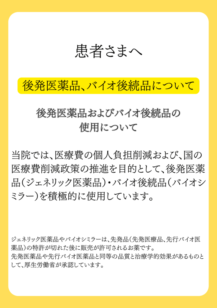 当院では、医療費の個人負担削減および、国の医療費削減政策の推進を目的として、後発医薬品(ジェネリック医薬品)・バイオ後続品(バイオシミラー)を積極的に使用しています。